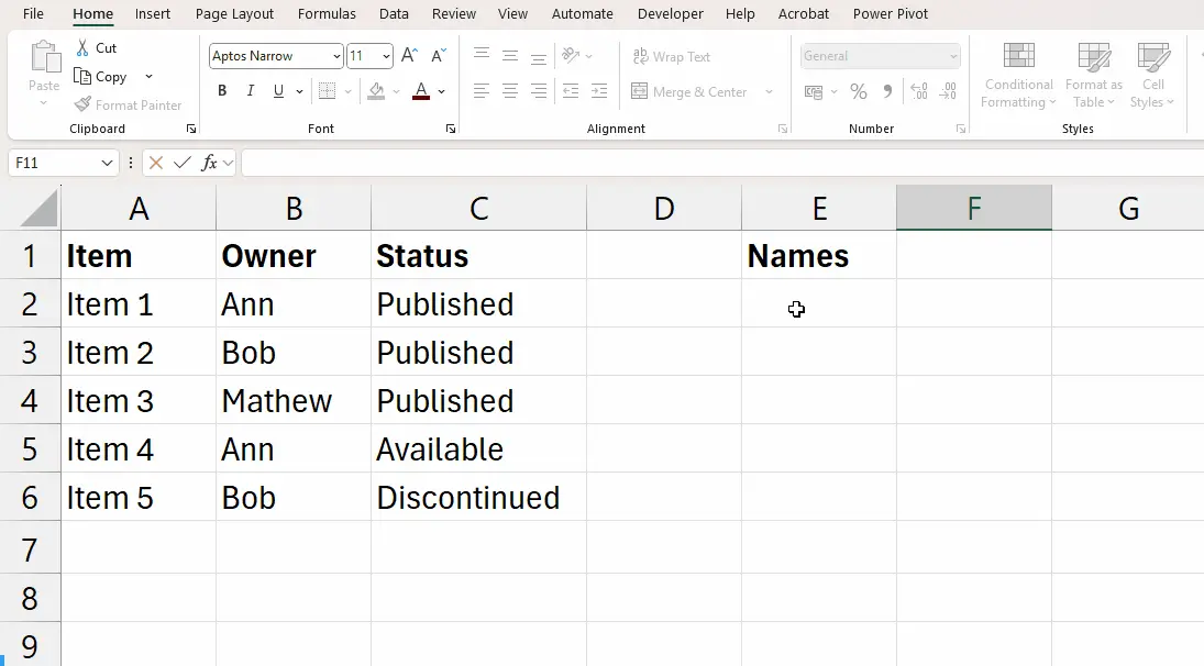 You have a list of items with columns for Owner and Status. You want a unique list of product names where: