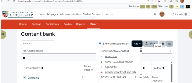 From here you can choose to upload a pre created H5P package, or Add a new H5P using the drop-down menu