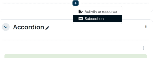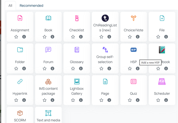 Next you need to create your activity. Within the Moodle module page, and with editing turned on, click on the + icon, then Add and Activity or resource in the topic you want to add it to and choose Add a new H5P Activity
