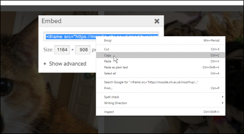 The screen will go opaque and show the embed code, you may need to scroll back up the screen to see it. Click on the code, select it all (ctrl A) and then copy it.