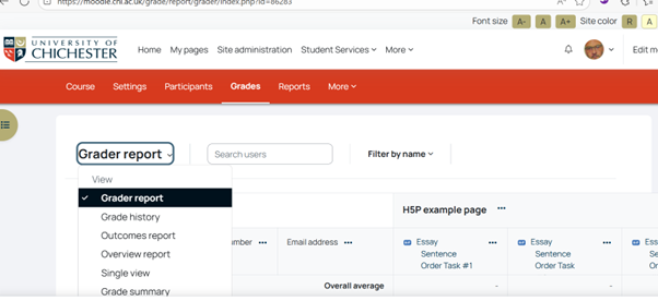 If you have set your students a task using H5P you can get the results through the Grades button. This can be found in the Moodle module menu: