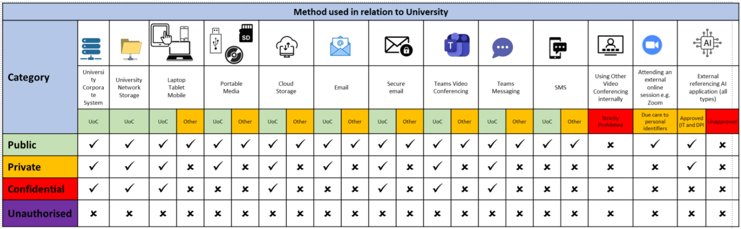 Any piece of information which contains any of the above must be processed in compliance with data protection legislation. This would include for example, student assessments either because it identifies them or, where in conjunction with other information the student can be identified. Confidential information should only be stored in University case management systems or University network storage. Using removable media, or storing any private information on a laptop, personal device or using personal cloud storage is strictly prohibited | |