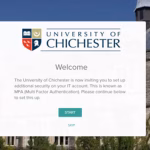 - Once installed, enrol with MFA by visiting mfa.chi.ac.uk. This is best to do from a web browser on a computer, but can also be done from your personal device. Read the welcome message and click ‘Start’ to begin