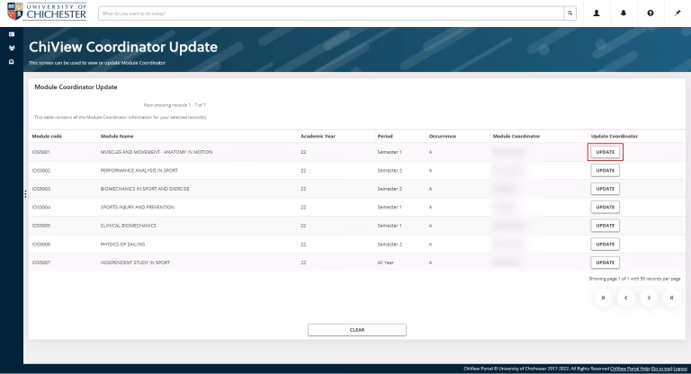- Select ‘Update Module Coordinator‘ in Programme/Module Coordinators and Administration Information on ChiView.